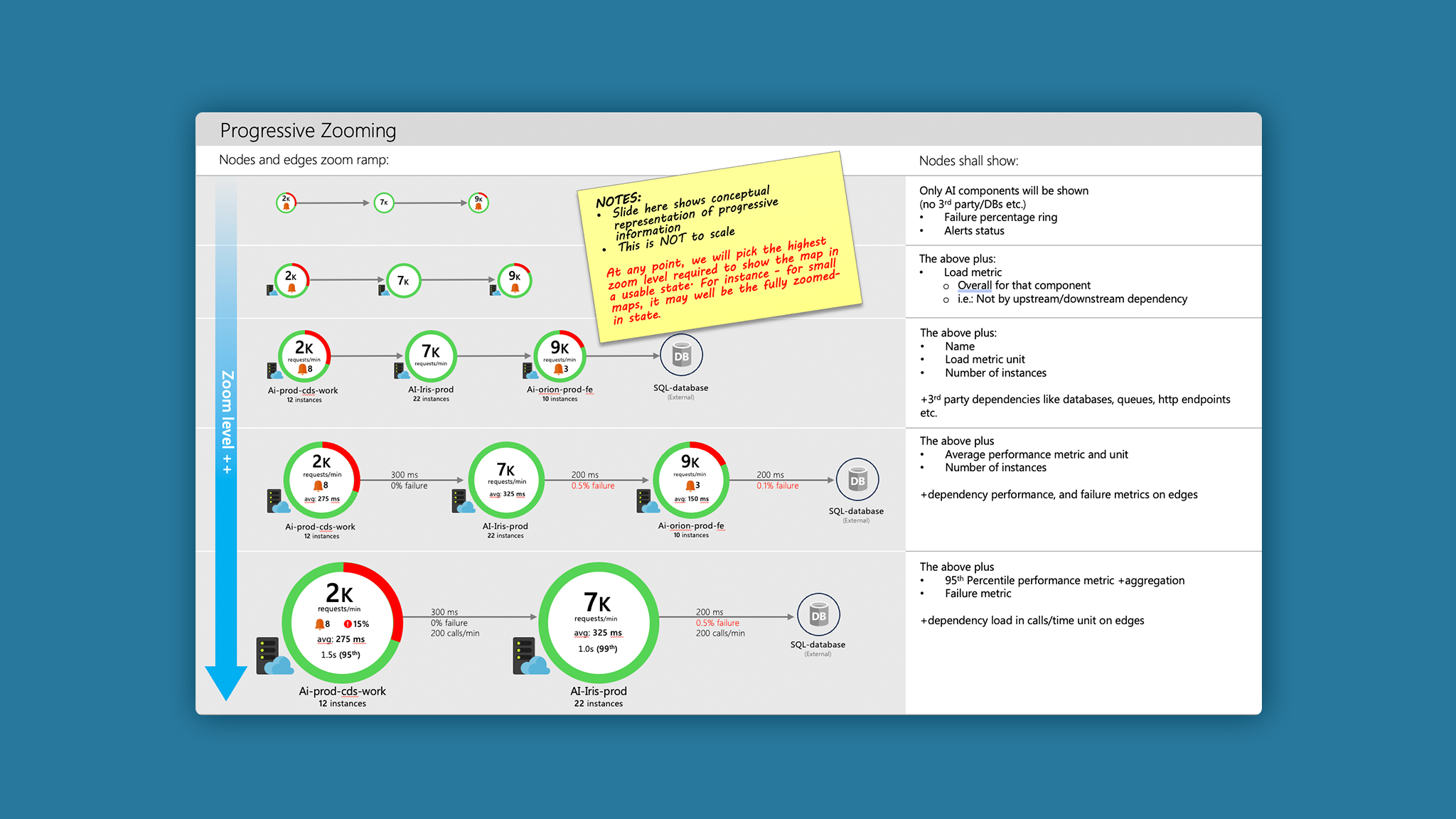 Market research revealed many existing application-based topologies favored clean circular nodes, which I adopted to optimize the map layout for scale. I added health info on the nodes and the connections between the nodes to quickly help identify problem areas. An adjacent historical timeline showing deployments and alerts was later cut due to development constraints.