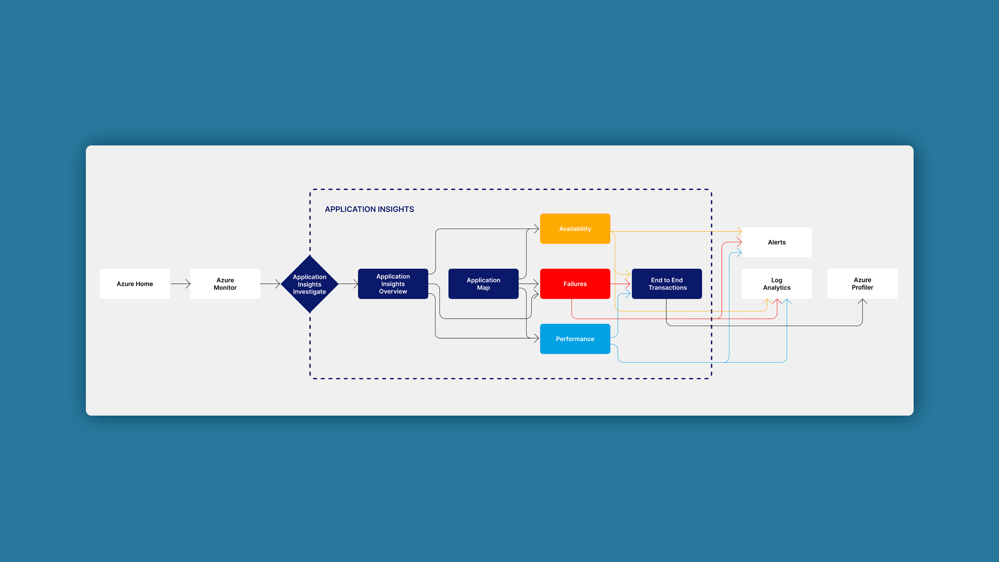 I began by working closely with the PM to create a user flow diagram that would demonstrate the customer journey, since one of the main goals of Application Map was to use it as an entry point to other Application Insights triage tools, like Availability, Failures, and Performance.