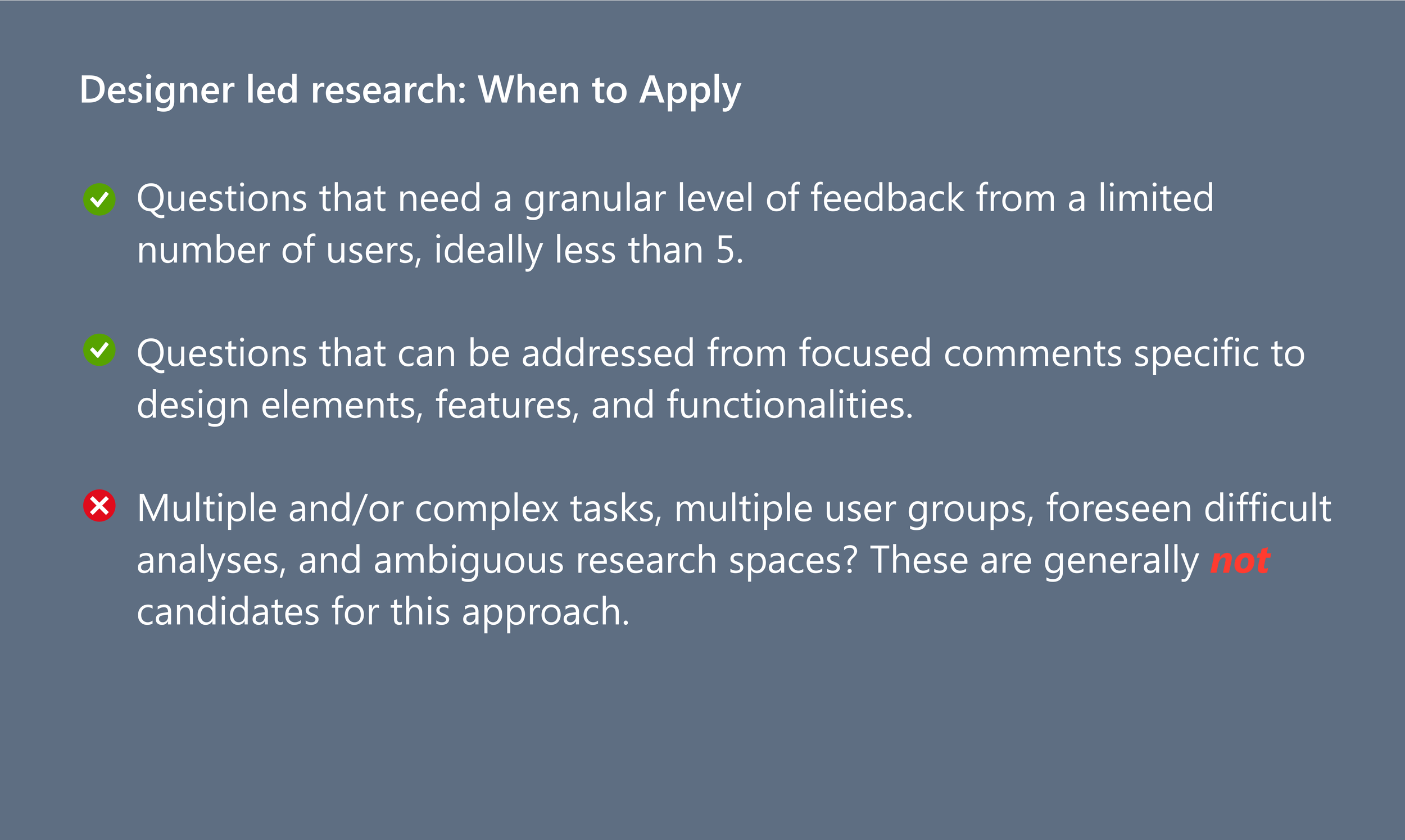I included guidance of when to apply this approach, to help Designers quickly identify projects that are appropriate for it, by answering a few determining questions.