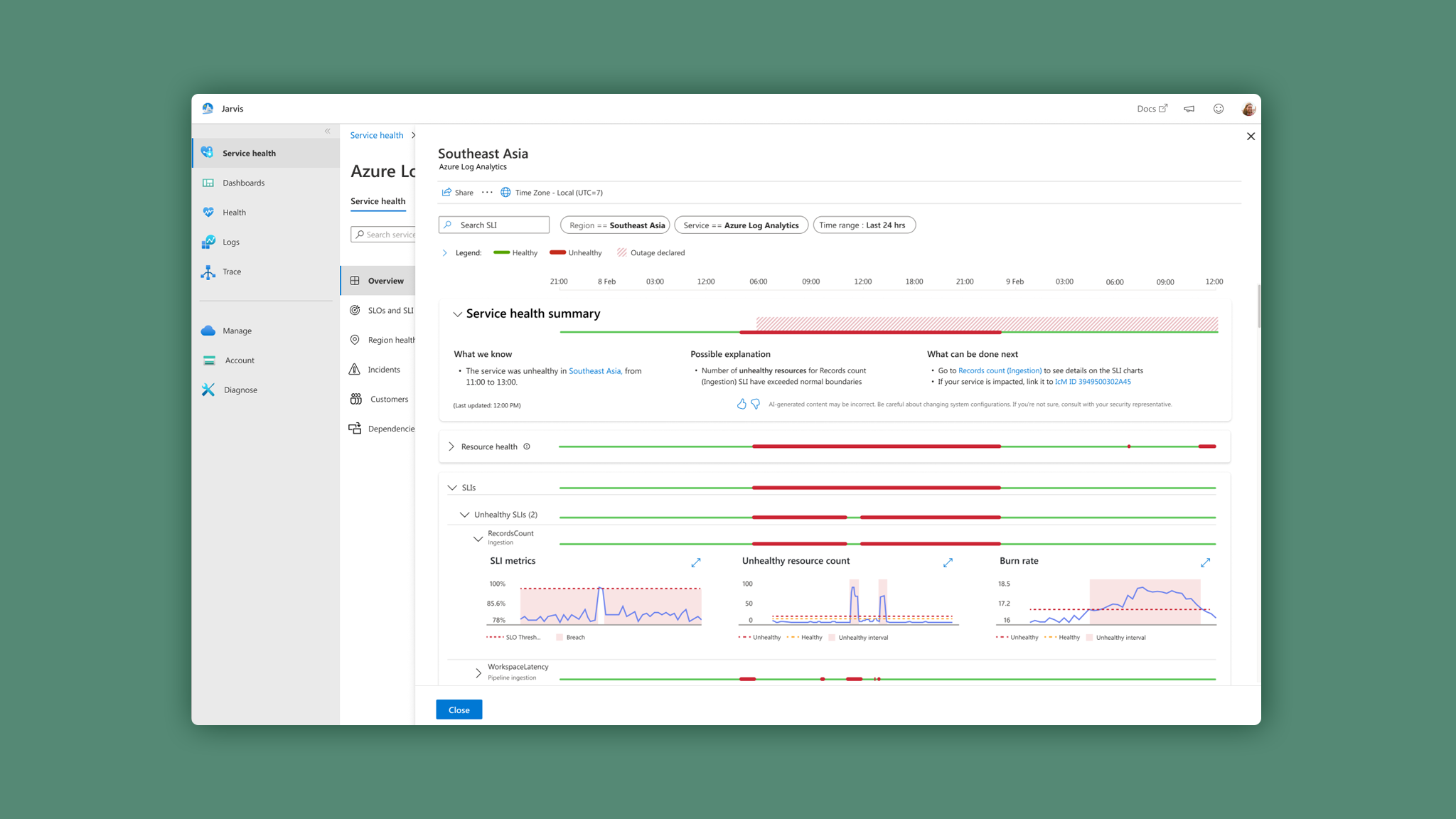 Service Health is a critical component of Microsoft’s internal monitoring platform, built for Service Owners, Azure Incident Managers (AIMs), DRIs, and executive leadership to manage the health of in-house applications, the product provided a quick view of overall service status with a regional health pivot.